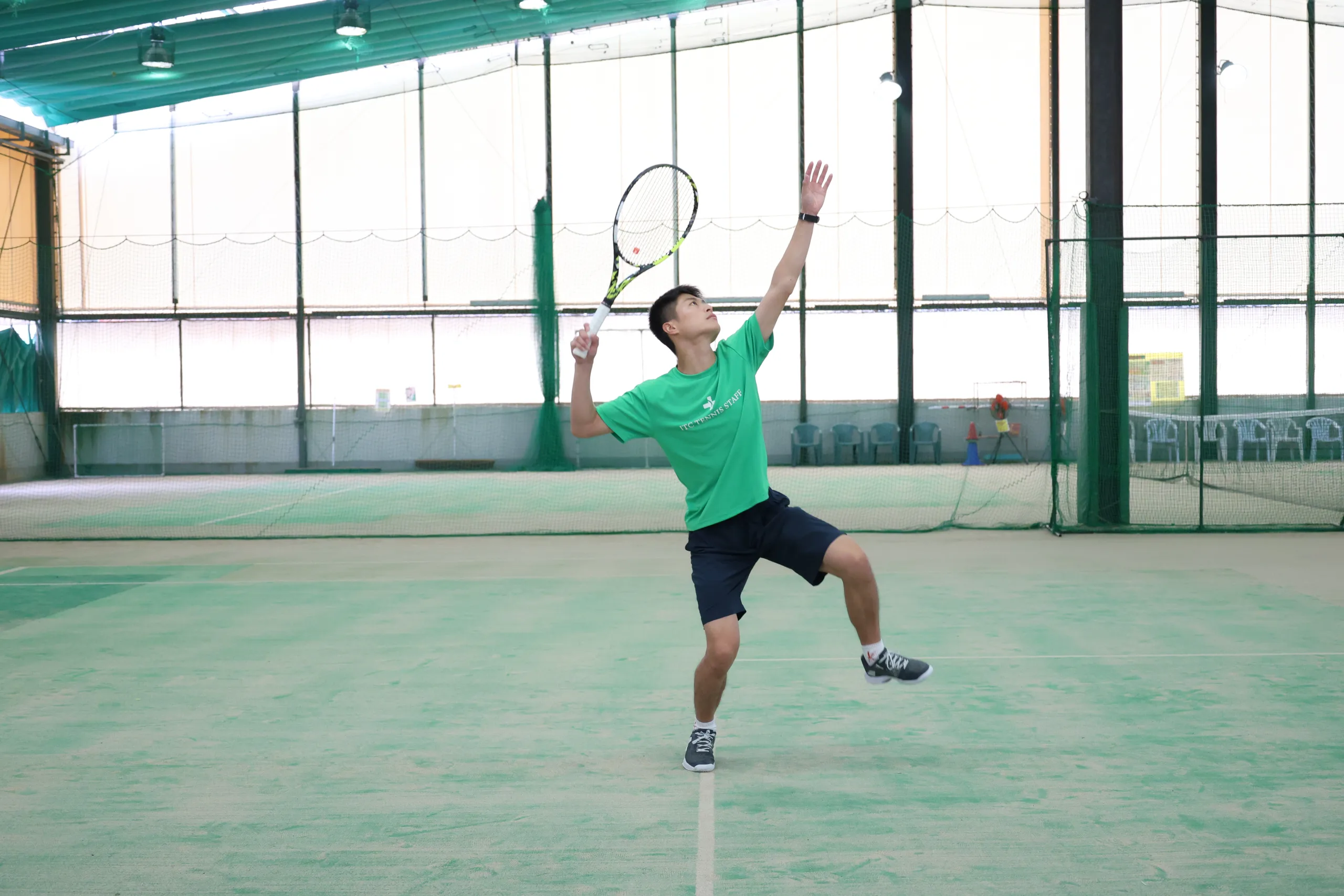 頭の真上になってしまうと、ラケットの面の向きが上向きになったまま当たってしまうため、真下に振れなくなります。