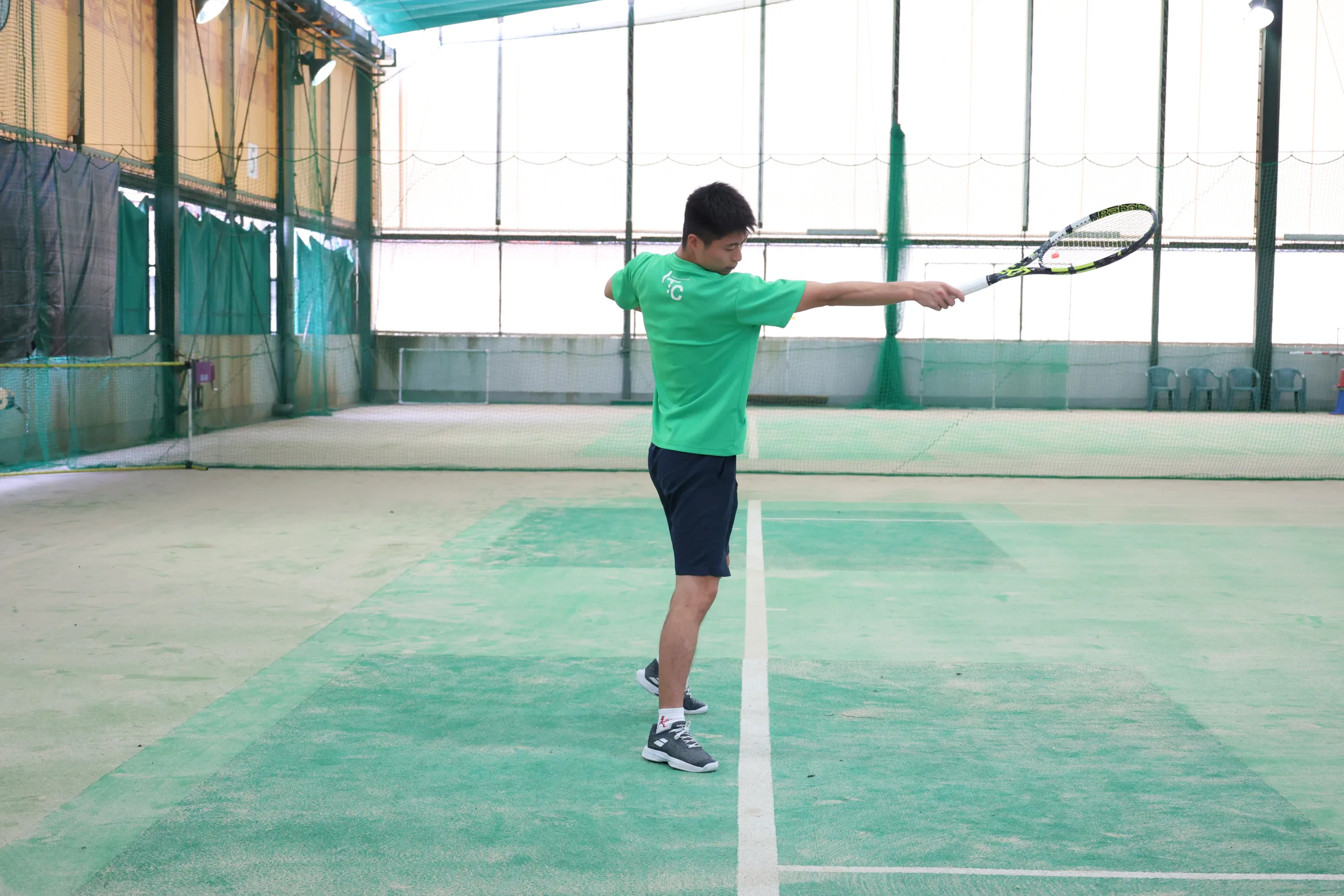 速い打球に対しては有効ですが、普段のストロークではコンパクトなスイングよりも「フォロースルーを大きく」を心がけましょう。