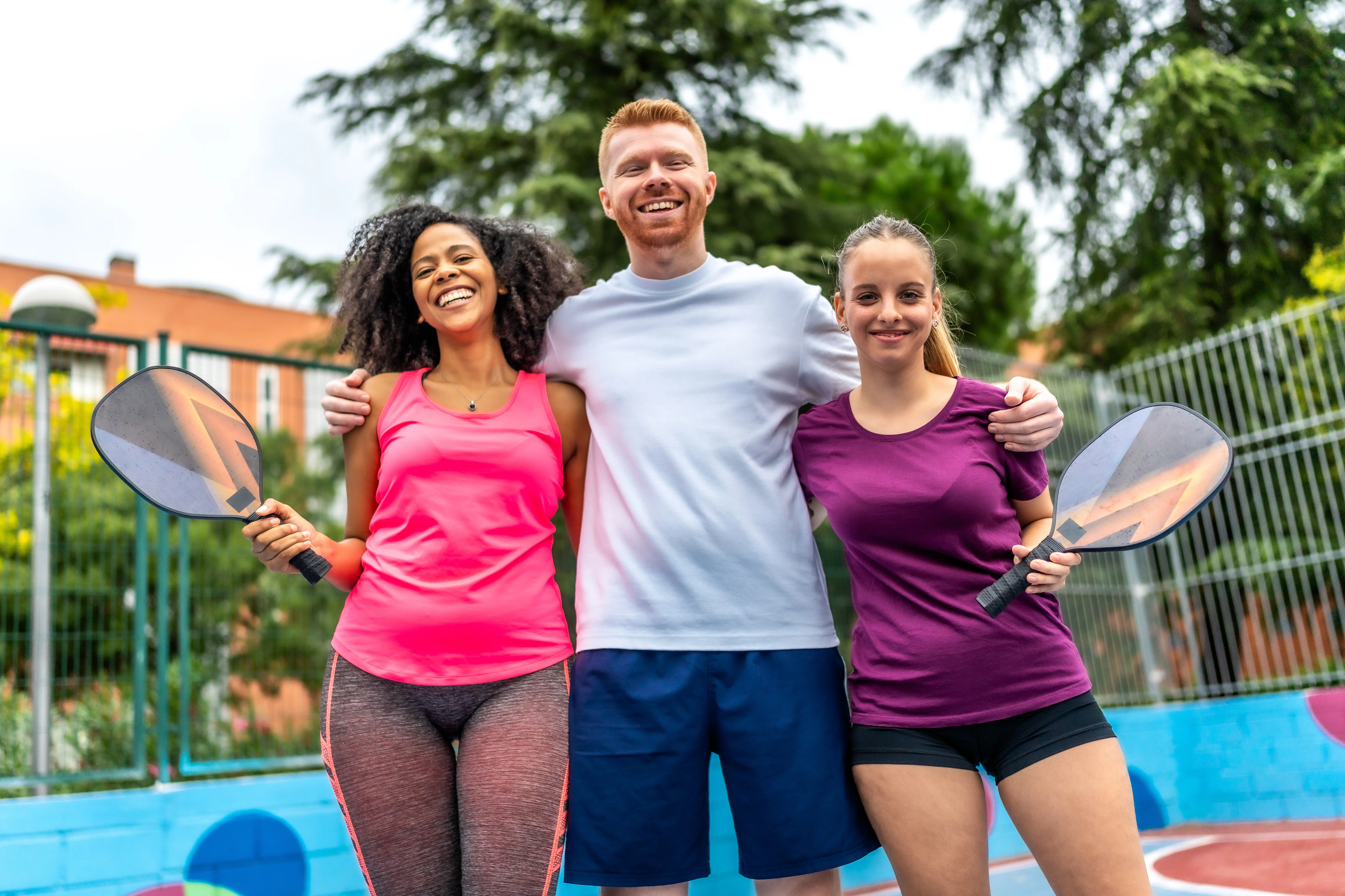 Portrait of a caucasian male pickelball instructor and two multi-ethnic women in court