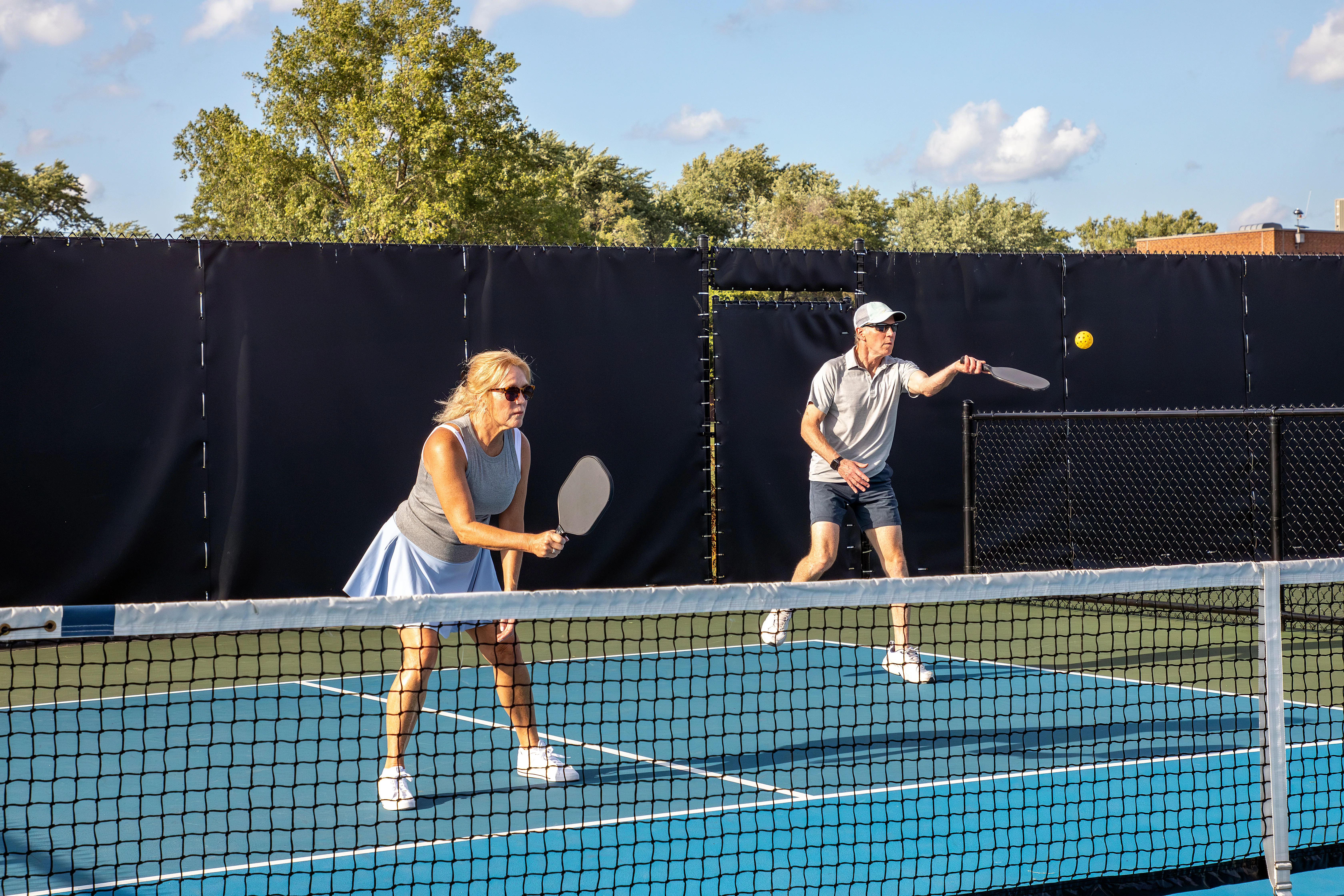 A male pickleball player returns a serve as his female partner stands at the net waiting for a return.